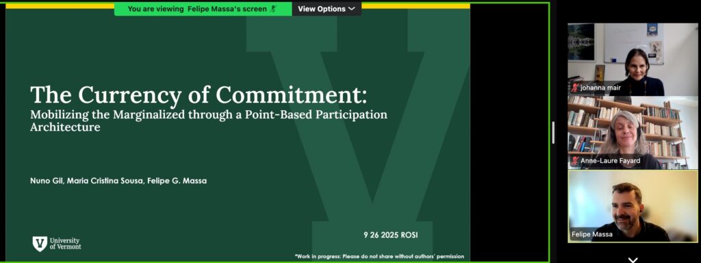 Felipe Massa started off the session with his work “The Currency of Commitment: Mobilizing the Marginalized through a Point-Based Participation Architecture” co-authored with Nuno Gil and Maria Cristina Sousa. Felipe began with the question: “How do we include the marginalized?”. While social movements intend to create participatory and decentralized forms of organizing, distributed movements without clear goals tend to fall apart and lose sight of their overall aims. Decentralization doesn’t mean disorganization, Felipe said. He emphasized that change doesn’t occur with energy alone, but when this energy is channeled in a direction towards their goals while maintaining inclusivity to marginalized groups. By following a social movement organization in São Paulo, Brazil, Felipe and his co-authors show how organizational attributes create a self-reinforcing cycle that allow the organization to maintain momentum toward social change. Following the presentation, we had a lively discussion surrounding what mechanisms may be underlying these cycles, how they were able to maintain inclusivity, and wondered when breakdowns may occur.